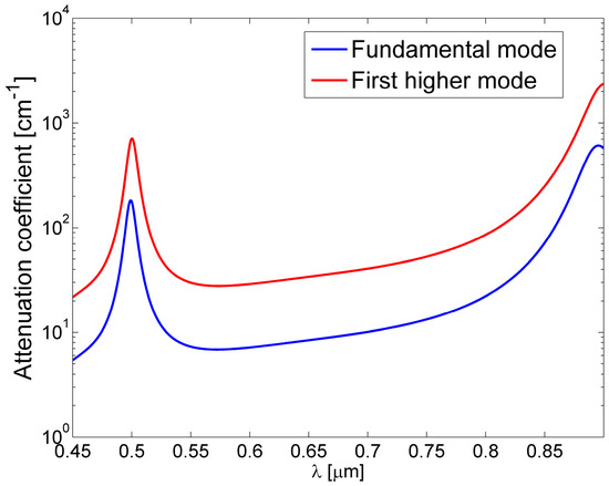A simple estimation of the attenuation coefficients in 2-D ARROW waveguides can be performed by using the one dimensional analytical model [11,15]. In a paraxial approximation the problem of the 2-D ARROW confinement can be separated into two 1-D problem for the lateral and transverse direction, in this way the evaluation of the total losses can be obtained from the addition of the resulting 1-D losses. In Figure 3 the losses for the fundamental (blue line) and first order mode (red line) versus wavelength calculated by using approximated analytical model, are shown. Hence, as anticipated, for a fixed core dimension higher order modes attenuate faster than the fundamental mode. From the figure the typical transmitted spectrum of an ARROW waveguide can also be foreseen. It is characterized by a broad spectral band, corresponding to the range of wavelengths which experience destructive interference in the claddings. The wavelength dependence of the propagation losses could be used to tailor the ARROW spectral response in sensing applications, i.e., to filter out unwanted optical wavelengths from reaching the detector.