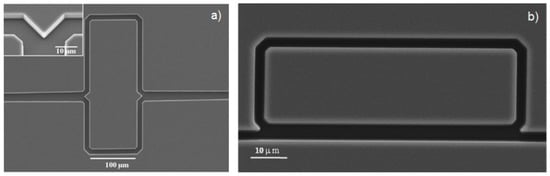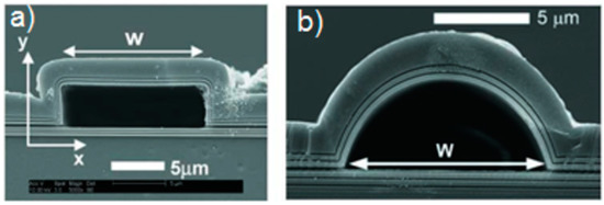 Single-mode ARROWs with arc-shaped core were also demonstrated [26] (Figure 4b). The authors fabricated such structures by sacrificial etching and demonstrated their ability to overcome the mentioned limitation of the PECVD process. Further important advantages compared with rectangular ARROWs are the higher mechanical stability and the smoother core walls. Optical characterization of such structures with four antiresonant claddings was also carried out [27]. A low attenuation coefficient of 0.26 cm−1 was obtained at λ = 633 nm with a high refractive index liquid core (ethylene glycol, nc = 1.43).