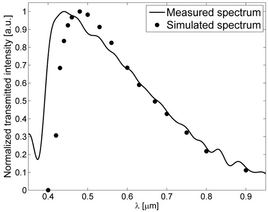 Measured and simulated transmitted spectrum from a single mode ARROW waveguide fabricated by ALD with d1 = 75.4 nm (TiO2), d2 = 262 nm (SiO2), dc = 10 μm, h = 5 µm, nc = 1.32 (methanol-filled core).