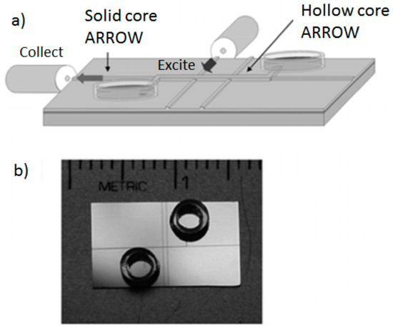 (a) Schematic of the proposed hybrid ARROW optofluidic platform with transverse section of liquid h-ARROW and solid h-ARROW; (b) Photograph of fabricated chip. Reprinted with permission from [95]. Copyright (2014) OSA.