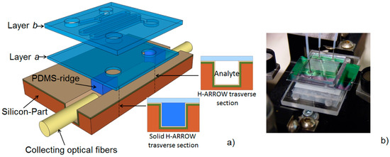 Based on bulk micromachining process, a hybrid ARROW optofluidic platform has been developed using the combination of PDMS and silicon-based materials. PDMS is extensively used in microfluidic technology because of its optical transparency in the visible/UV region, the biocompatibility and the low-cost fabrication procedures, like soft lithography [94]. The opportunity of combining silicon and polymer technologies has been firstly demonstrated with the fabrication of a single-mode h-ARROW, as reported in the work of Testa et al. [28]. Starting from this vision, the optofluidic platform has been assembled in a modular structure, with the upper polymer parts having both optical and microfluidic functions [95] (Figure 8). In particular, by moving from the bottom to the top of the structure, in the first PDMS layer (layer a) hybrid solid-core ARROWs have been integrated to deliver the optical signal towards the collection optical fibers. They also sealed the open-ended channels, preventing liquid evaporation. Merely fluid handling functionalities were restricted to the second PDMS layer (layer b), where a microfluidic mixer was incorporated. Such layer can be easily replaced with another, in order to adapt the microfluidic system to specific sensing applications. This confers to the platform high design flexibility. A multimode h-ARROW was used in order to allow self-aligned positioning of off-chip fibers with solid waveguides through the optofluidic channels. The sensing performance of the device was tested by performing fluorescence measurements at different dye concentrations, controlled by means of the integrated micromixer; an LOD of 2.5 nM was demonstrated. Even if this value is high as compared with the current state of the art of fluorescence measurement using evanescent waveguide sensors [96], the proposed modular approach for chip assembling into a compact and multifunctional format is very promising and offers prospects of an increased flexibility. For comparison, a modular approach for slot biochemical sensors have also been recently proposed in the work of Carlborg et al. [52] An array of optical slot-waveguide ring resonator sensors has been packaged into a chip incorporating microfluidic sample handling, with a microfluidic layer assembled in a compact cartridge. The authors demonstrated a volume refractive index detection limit of 5 × 10−6 RIU and surface mass detection limit of 0.9 pg/mm2.