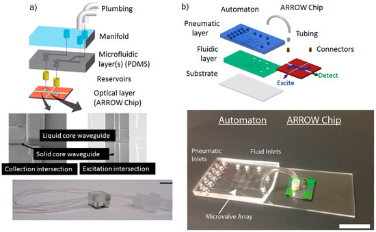 (a) Expanded view of PDMS integration with an ARROW optofluidic chip. Pictures are SEM images of optical intersections. Reprinted with permission from [97]. Copyright (2013) RSC Publishing. (b) Schematic of hybrid integration of automaton and ARROW chips. Reprinted with permission from [98]. Copyright (2014) AIP Publishing.