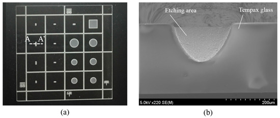 Illustration images for sandblast results. (a) Sandblast result on 2 cm × 2 cm Tempax glass wafer; (b) A-A′ cross session.