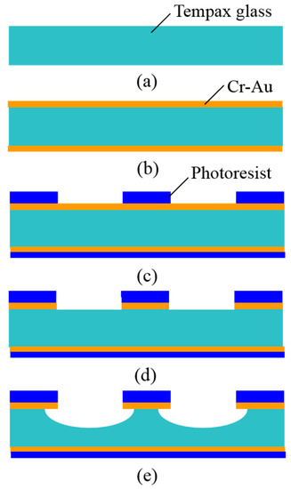 Wet etching process. (a) Tempax glass; (b) Cr-Au sputter; (c) photolithography; (d) Cr-Au wet etching; (e) glass wet etching.