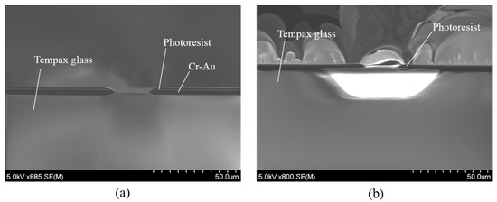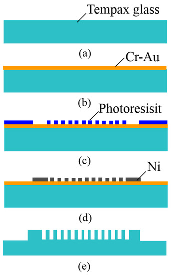 The 300-μm-thick Tempax glass wafer (Figure 6a) was used for this investigation. Cr-Au was used as a seed layer for electroplating with thicknesses of 10 nm and 40 nm, respectively. They were deposited on the Tempax glass wafer via sputtering (Figure 6b). A 1-μm-thick positive photoresist (TSMR V90, Tokyo Ohka Kogyo, Kanagawa, Japan) was then coated on the Cr-Au films and patterned via immersion lithography (Figure 6c). A mold formed by the photoresist film was filled with nickel via an electroplating method. The 600-nm-thick nickel was formed on the Cr-Au surface (Figure 6d). Next, the photoresist was removed with a resist stripper (MS-2001), and the Tempax glass was etched out via the RIE process using a mixture gas of SF6 and O2.