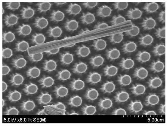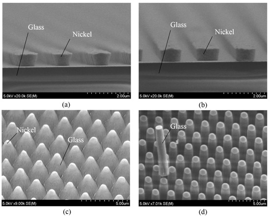 The experimental processes on magnetron-type RIE of the Tempax glass substrate with different nickel mask shapes were studied. The cross-sectional images of tilted (mask #1) and vertical mask (mask #2) shape profiles are shown in Figure 7a,b, respectively. The Tempax glass wafer was etched out under the same conditions mentioned above for both mask shape profiles. Firstly, RIE was performed by using mask #1. The RIE etching result indicated a tapered cylinder shape (base angle ~80°) and the 30°-tilted SEM (scanning electron microscope) image of the etched profile is shown in Figure 7a. The etched profile in the case of mask #2 is shown as a vertical shape (base angle ~89°) in Figure 7b. Thus, glass pillars having smooth surfaces, vertical shapes and a high aspect ratio of 10, with an etched depth of 10 μm and a pillar diameter of 1 μm, were achieved. From those experiments, the mask profiles are thought to influence the etched profile due to the reflection of ions at mask side walls and the mask damage caused by the mask etching.