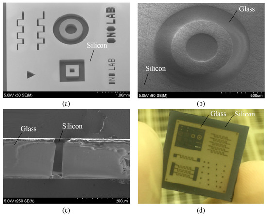 The patterning silicon wafer and Tempax glass was bonded together at 400 °C with an applied voltage of 800 V for 15 min (Figure 10c). This process was performed in a high vacuum chamber of 0.01 Pa for eliminating air from the cavities of silicon mold. Then, the bonded silicon-glass wafer was annealed in an atmospheric furnace with a high temperature of 750 °C for 10 h (Figure 10d). Tempax glass was melted and filled into cavities of silicon mold because the transition temperature of the Tempax glass was around 550 °C. Then, both of the Tempax glass and the silicon sides of the wafer were lapped and polished via CMP (chemical mechanical polishing) (Figure 10e). The complete filling process into cavities was achieved as shown in Figure 11b–d. Thus, the glass micromachining can be done via the glass reflow process.