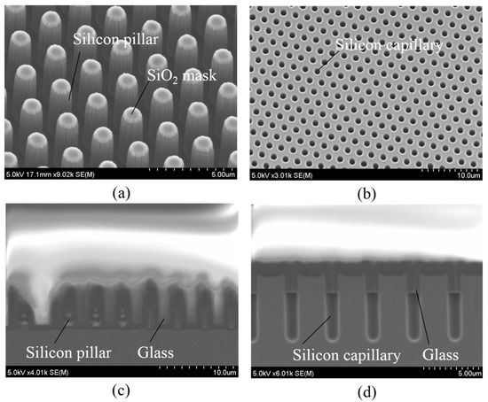 A thin SiO2 film with a thickness of 50 nm grown on the surface of a silicon mold via dry thermal oxidation before anodic bonding process was proposed. The merits of this SiO2 can enhance the surface wettability against the glass; therefore, the glass can very easily penetrate small cavities such as the pillar and capillary molds. Moreover, the organic materials or passivation layer of silicon molds due to the deep RIE process can be removed because of the high temperature process of thermal oxidation. Therefore, the lower pressure level of silicon molds can be achieved after sealing process. The third reflow condition at a high temperature of 1100 °C with a long process time of 20 h was performed. The complete filling process into the pillar mold was observed while only 2.5-μm-thick glass could penetrate the capillary mold. The experimental results under the third reflow condition for pillar and capillary molds are shown in Figure 12c,d. Thus, glass reflow into micro-capillary molds is more difficult than that into micro-pillar mold. The possible reasons are due to small space and high surface tension of the micro-capillary mold. A longer reflow process time may be one of the solutions to an adequate fill into this mold.