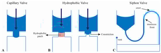 - Cho, H.; Kim, H.; Kang, J.; Kim, T. How the capillary burst microvalve works. J. Colloid Interface Sci. 2007, 306, 379–385. [Google Scholar] [CrossRef] [PubMed]
