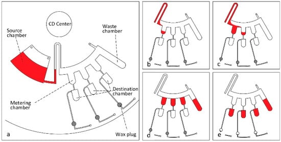 - La, M.; Park, S.M.; Kim, D.S. Centrifugal multiplexing fixed-volume dispenser on a plastic lab-on-a-disk for parallel biochemical single-end-point assays. Biomicrofluidics 2015, 9, 014104. [Google Scholar] [CrossRef] [PubMed]