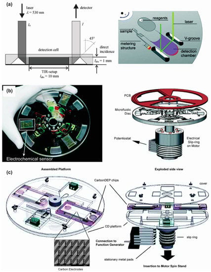 - Steigert, J.; Brenner, T.; Grumann, M.; Riegger, L.; Zengerle, R.; Ducree, J. Design and Fabrication of a Centrifugally Driven Microfluidic Disk for Fully Integrated Metabolic Assays on Whole Blood. In Proceedings of the 19th IEEE International Conference on Micro Electro Mechanical Systems, Istanbul, Turkey, 22–26 January 2006; pp. 418–421.