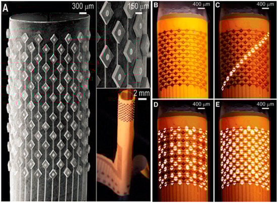Micrographs of cylindrical display assembled in two self-driven assembly steps: Patterned self-assembly of LEDs onto a bottom electrode and self-alignment of a top electrode. (A) SEM and optical images of LEDs that assembled into a regular array. (B) Photograph of the display after self-alignment of the top electrode. (C–E) Photographs of the operating display segment. Reprinted with permission from [32].