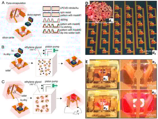 Fabrication strategy to assemble and package integrated semiconductor devices by sequential-shape-and-solder-directed self-assembly (SSSDSA). (A) Layout of the self-assembly components: carrier, device, and encapsulation unit that are fabricated by surface micromachining and etching. The illustrated device segment is an LED that has two contacts: a small circular anode on the front, and a large square cathode covering the back. The silicon carrier has a solder-coated area in a tapered opening to host a single semiconductor device segment. The encapsulation unit has five solder-coated copper areas inside a tapered opening to connect to corresponding contact pads on the device and carrier. Images of Chip-on-carrier assembly (B) and chip encapsulation (C) in an ethylene glycol solution at a temperature of 100 °C, where the solder is liquid. The components are agitated using a piston pump and self-assemble and form a three-dimensional circuit path between device layers that allows testing in a surface-mount device configuration. (D,E) Testing of LED chips that have been assembled and packaged by SSSDSA. (D) Photograph of a cluster of 200 encapsulated devices that were assembled by the self-assembly process (d1) and test of an array of LEDs that are mounted by hand on a printed circuit board (d2). (E) Close-up photographs of the LED assemblies in the OFF (e1) and ON (e2) state, visualizing the formation of three-dimensional circuit paths between the different device layers and the printed circuit board. From [36], copyright (2004) National Academy of Sciences, USA.
