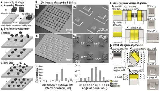 Strategy (A) results (B) and design rules (C) to assemble and connect chip-scale components with different dimensions, single-angular orientation, and contact-pad registration. (a1) Self-assembly elements depicting dies with a gold contact and two-element docking sites containing alignment pedestals and solder-coated areas. (a2) Two-step self-assembly sequence to populate the substrate with different components. The reduction of the interfacial free energy drives the assembly process into a stable position. (b1–b4) SEM images of silicon dies that have been assembled using a combination of alignment pedestals, solder-coated areas, and sequential batch transfer. 10 × 10 array that contains alternating rows of 900 µm and 500 µm dies that are surrounded by Si alignment pedestals (b1,b2) and SU-8 alignment pedestals (b3,b4) that was used to study the alignment accuracy. (b5) Histograms of the measured values. (C) Computer-aided design (CAD) approach that is used to eliminate defects and establish design rules together with experimental results. Rectangular receptor/binding site design that favors the 0° (c1) and 180° (c2) angular orientation along with predictions of defects (c3) and (c4). (D) Alignment-pedestal designs to eliminate defects. (d1) Single-pedestal designs with h1 ≤ h2 eliminate the 180° conformational overlap and yield the correct orientation in 98% of the cases. (d2,d3) Pedestals on the side eliminate the attachment of two components. l and w indicate the permissible range of the opening to ensure defect-free assembly. Reprinted with permission from [39].