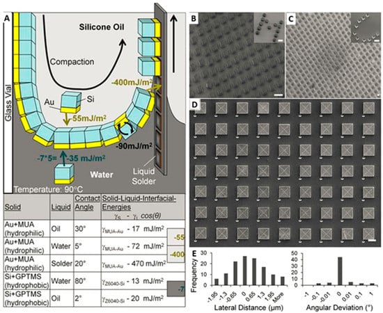 (A) Mechanism of surface tension directed self-assembly at a liquid–liquid–solid interface employing an energy cascade to (i) move components from a suspension to the interface, (ii) pre-orient the components within the interface to face in the right direction, and (iii) assemble the components on molten solder through dipping. The illustration depicts the situation for an oil–water interface and chiplets made out of Si (SU-8 is detailed in the main body), which carry an Au contact on one face. Depicted Au and Si surfaces are treated using hydrophilic mercaptoundecanoic acid (MUA) and hydrophobic 3-glycidoxypropyltrimethoxysilane (GPTMS) functional groups and yield the tabulated measured contact angles, calculated solid–liquid interfacial energies, and energy differences (gray boxes to the right) required to drive the assembly. The available area and curved shape of the interface cause the components to form a closely-packed 2D sheet. Upward motion of substrate yields a dynamic contact angle where the receding water layer becomes sufficiently thin for the gold to contact the solder. SEM images of SU-8 (B) and Si (C,D) chiplets assembling in regular arrays and arbitrary text patterns (insets). The overlaid CAD guides visible in (C, white lines) are used to measure variations in the center-to-center distance and angular orientation. (E) Histogram of measured variations. 40 µm scale bars. From [40], copyright (2004) National Academy of Sciences, USA.