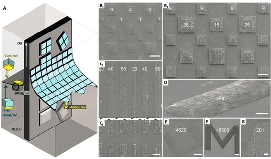The previously reported assembly process was subsequently extended to support packing of small semiconductor tiles to produce functional photovoltaic cells [41]. As shown in Figure 5A, assembly took place at the water–oil–solid interface on a flexible substrate which was pre-coated with solder in a defined pattern to accommodate a different integer number of components. When the sample is pulled upward through the water–oil interface with a speed of 30 mm/s, the Au-coated component side gets into contact with molten solder with a reduced contact angle. This causes a reduction of the surface energy of the molten solder bumps, and consequently the assembly of components. The substrate domains were patterned in different dimensions to accommodate different numbers of dies. Figure 5B1–G are the images of the tiled dies with different domains. Presented results show that the tiling was possible from a single domain to a large domain where several thousands of components were accommodated in tiling fashion without any intermediate gap. The largest domain contained over 6500 tiles closely packed with less than 3% vacancies. However, crystallographic defects were observed where crystal fronts merged in rounded region and in elbows (Figure 5G).