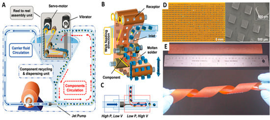 Automated reel-to-reel (RTR) fluidic self-assembly scheme. (A) Overview depicting (i) component dispensing on the basis of liquid flow and gravity, which transports the components to empty self-assembly sites (receptors) on a continuously advancing web, (ii) where the components attach at predetermined locations on the basis of surface tension directed self-assembly, and (iii) where recycling of access components is achieved on the basis of gravity at the turning point of the web before they are transported upward on the basis of a fluid drag inside a sufficiently-small-diameter channel. Mechanical up and down motion of the web is used to induce liquid flow and shear forces to dispense and agitate the components as well as to aid in the removal of access component in the region of the upside-down-oriented web. (B) Schematic depicting the details of surface tension directed self-assembly using molten-solder-bump-based-receptors to capture and connect to the metal contacts on the chips. (C) A jet pump-based principle is used to achieve recirculation of the chips without passing the components through a mechanical pump where they would get damaged. A preferred location of the jet pump is at the bottom of the slanted funnel where access components arrive on the basis of gravity to be picked up by a high velocity directional jet. (D) Periodic assembly onto 1.1 mm pitched square lattice points, 820 chips, 6 defects. Photograph and (E) Overview depicting continuous assembly onto a 2 cm wide and 29 cm long assembly region. Reprinted with permission from [42].