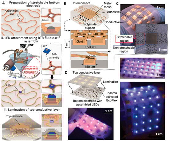 Park et al. reported first tests and the realization of a millimeter thin and rubber-like solid state lighting module fabricated using a roll-to-roll self-assembly machine, as described above [53]. The assembly process followed the same procedure as described in [42]. Figure 7A presents the overview of the basic steps of fabrication and assembly: (i) fabrication of the bottom electrode; (ii) assembly of LEDs; and (iii) lamination of the top electrode. The bottom electrode was designed as meander-shaped structure to tolerate the stress during stretching. It had two main components: a stretchable region, and a non-stretchable region for assembly of the rigid component. Experimentally, the bottom electrode alone could be stretched up to 220% of the original length without breaking the electrical contact to the assembled component. A cured silicone (Ecoflex) foil was used as a stretchable substrate. LEDs (300 μm × 300 μm × 150 μm) with bottom (large square) and top contact (small circle) pads were used. Assembly was performed using the RTR machine on Ecoflex with pre-coated solder on the receptor sites. The top contact was made to the components by lamination of the top electrode. The electrodes separately had a stretchability of 220%, the stretchability of the entire system after lamination of both electrodes was reduced to 170%.