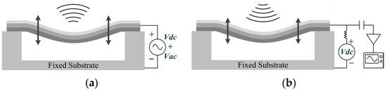 Figure 1. Working principles of a multilayer membrane capacitive micromachined ultrasonic transducer (CMUT) (a) as a transmitter and (b) as a receiver.