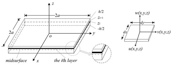 where ω is the angular frequency of the vibrating multilayer membrane. u 0 t ( x , y ) , v 0 t ( x , y ) , and w 0 t ( x , y ) are the vibrating displacement components in the midsurface in the x, y, and z directions. λ x t and λ y t are the vibrating rotations of the midsurface about the x/y axis given by