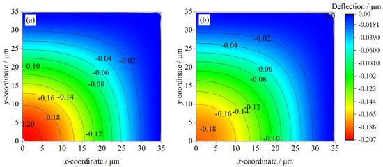 Figure 3. Deflection contours of (a) CMUT A for 0.5 MPa and (b) CMUT C for 0.5 MPa.