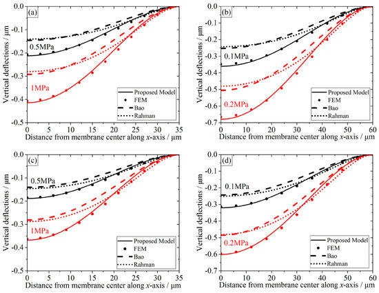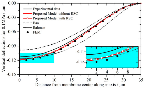 From Figure 8 and Table 5, it can be observed that the proposed model’s predictions are in good agreement with the FEM simulations and the experimental data. The deviations between the proposed model and the experimental data are reducing along from center to membrane edge. After the residual stress compensation, the central deflection becomes nearer to the experimental data, and the relative errors between the proposed model and the experimental data have reduced from 5.42% to 4.14%. Bao’s predictions are smaller than the experimental data, while the other four results are bigger. Rahman’s deviation at membrane center is the smallest, and the deviations increase along the x-axis.