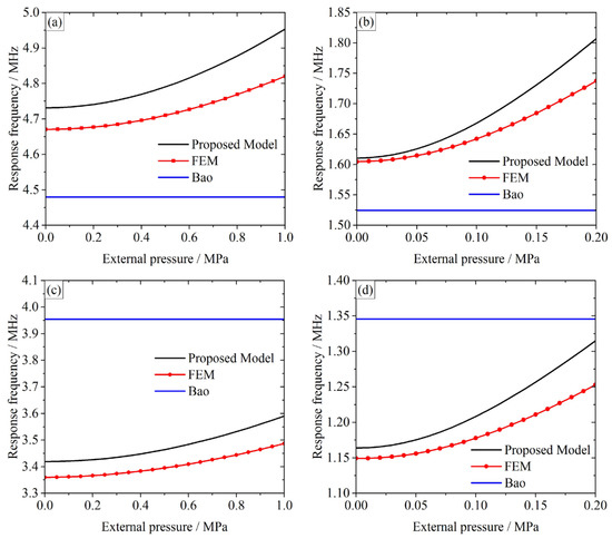 From Figure 6a and Table 4, it can be observed that when the external pressure increases, the response frequency and the relative error increase, too. When the external pressure is 0, the relative error between the proposed model and FEM is the smallest (1.31%). For the 1 MPa case, the relative error is increased to 2.75%, which is still within an acceptable range.