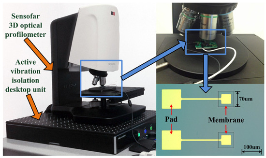 The static deflection testing system is illustrated in Figure 7. The Sensofar 3D optical profiler (S neox Non-contact 3D Optical Profiler, SensoSCAN 5.3, Sensofar, Barcelona, Spain) is located on the Accurion active vibration isolation desktop unit (Accurion GmbH i4-OD-3173, Accurion GmbH, Goettingen, Germany). An image of the CMUT is obtained using a blue LED light source (the wavelength is 460 nm) for a high lateral resolution.