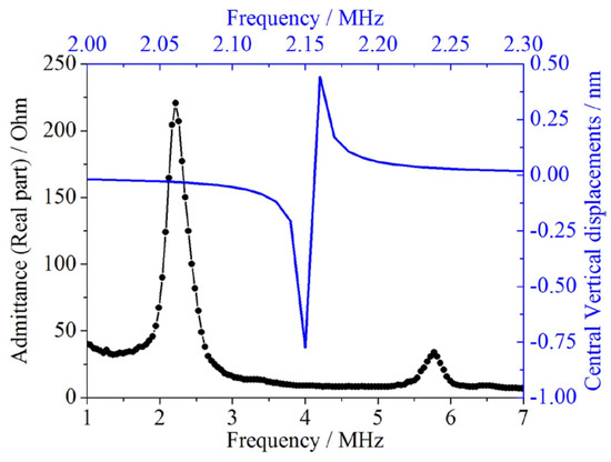 Note that the experimental data and FEM simulations are arranged using different horizontal and vertical coordinates for a clearer view. This is more suitable, since the impedance measurements represent the real part of the admittance values changing with respect to frequency, while the FEM simulations represent the vertical displacements of membrane center varying with frequency.