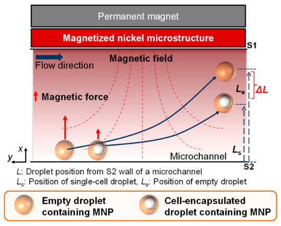 If this difference of lateral deflection between single cell-encapsulated droplets and empty droplets is enough, it is possible to sort one type of droplet among the mixed droplets (Figure 1). In addition, lateral deflection is also affected by the initial concentration of MNPs that are injected into the inlet and the relative difference of volume between single cell-encapsulated droplets and empty droplets.