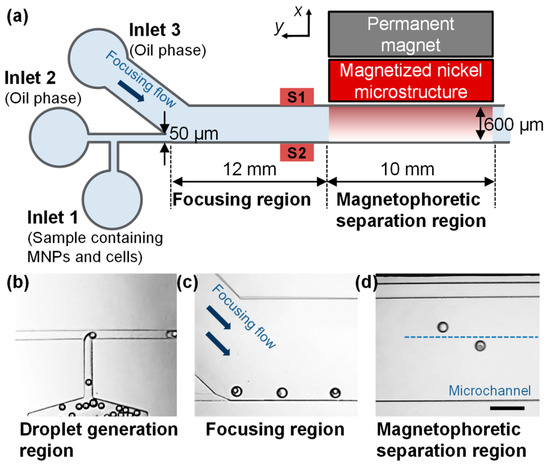 (a) Schematic view of a microfluidic device for magnetophoretic droplet sorting; (b) Droplets are generated with MNP solution and cells (or microbeads); (c) The droplets are focused to the side wall (S2) of the microchannel by oil phase flow from inlet 3; (d) Single cell (or microbead)-encapsulated droplet are separated by magnetic field. The scale bar is 200 μm.