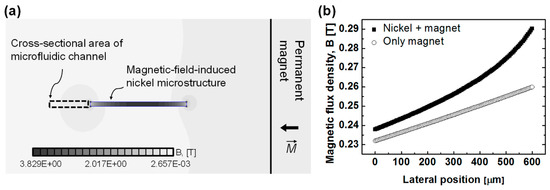 (a) Numerical analysis of the enhanced magnetic flux density at the cross section of the microchannel to evaluate the effect of a nickel microstructure (solved by the finite element method magnetics (FEMM)); (b) Comparison between the magnetic flux densities according to the presence of a nickel microstructure.
