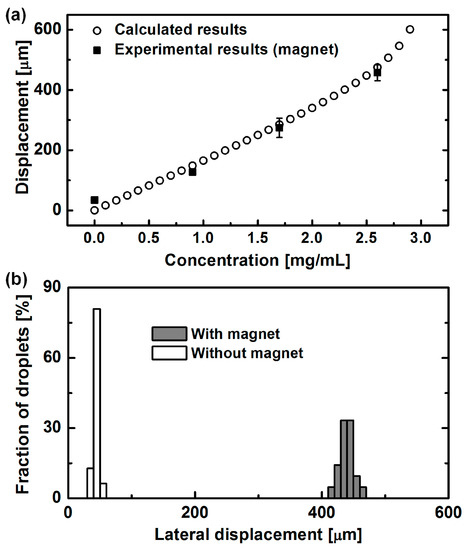 The effect of magnetic force acting on the droplets. (a) Lateral displacement of droplets according to the concentration of MNPs inside the droplets. Higher concentration of MNPs leads to the higher magnetophoretic deflection. (b) Lateral displacement of droplets with and without magnetic field. Droplets were laterally deflected only by magnetic force.
