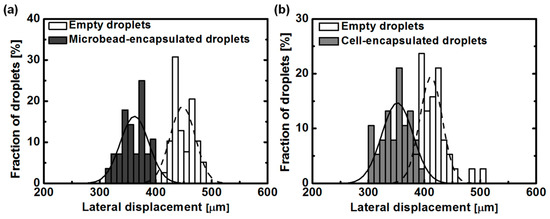 On the basis of results for the change of MNP concentrations, we investigated the lateral deflection of droplets containing single microbeads. The same-sized droplets contain approximately equal amounts of MNPs, showing the same magnetic force acting on the droplets. An occupation of a microbead inside a droplet reduces the number of MNPs inside the droplet because MNPs are monodisperse in solution. The magnetic force acting on a microbead-encapsulated droplet decreases by the reduced amount of MNPs inside the droplet. This reduced magnetic force leads to the difference of lateral deflection between microbead-encapsulated droplets and empty droplets. To demonstrate this difference in lateral displacement, microbeads with a diameter of 45 μm and MNPs solution with a concentration of 2.6 mg/mL were used. Two different droplets (e.g., single microbead-encapsulated droplets and empty droplets) containing monodisperse MNPs were generated with the same size (70 μm-diameter droplets). The droplets generated from the T-shaped microchannel were focused and aligned at side wall S2 by the flow of mineral oil from inlet 3. While the droplets passed through the separation region, the difference of magnetic force acting on two types of droplets led to the separation of the droplets. Figure 5a shows the distribution of lateral displacement for the two types of droplets at the end of the separation region. It was confirmed that empty droplets were more attracted toward side wall S1 than single microbead-encapsulated droplets. The average lateral displacement of empty droplets and single microbead-encapsulated droplets was found to be 448 and 360 µm, respectively. It seems that a large distribution of single microbead-encapsulated droplets was caused by the size variation (CV ≤ 10%, provided from a manufacturer) of microbeads because the number of MNPs inside the droplet is dependent on the volume of encapsulated microbead. In this experiment, due to the physical size of two microbeads, it is very difficult to generate the droplets containing more than two microbeads at the experimental condition for the droplet generation.