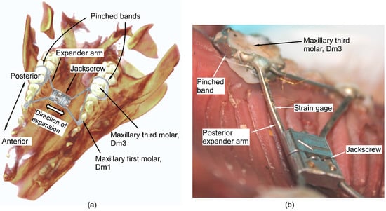 The posterior arm of the expander was affixed with a single axis, U-shaped p-doped silicon semiconductor strain gage (SS-018-011-3000PU, Micron Instruments, Simi Valley, CA, USA). To house the strain gage, a flat surface was machined on the arm using micro-electrodischarge machining (μEDM) [19]. The strain gage was attached using cyanoacrylate adhesive (Figure 1b) and then covered with light-cure Transbond XT (3M Unitek, Monrovia, CA, USA) dental composite. The custom hyrax-design expander was then cemented into place using light-cure OptiBand Ultra (Ormco Corporation, Orange County, CA, USA) dental composite. Leads were soldered to the sensors to measure resistance during expansion. The strain gage resistances were read in real-time using data acquisition device NI6341 and LabVIEW (National Instruments Corporation, Austin, TX, USA) at a sampling rate of 10 samples/s.