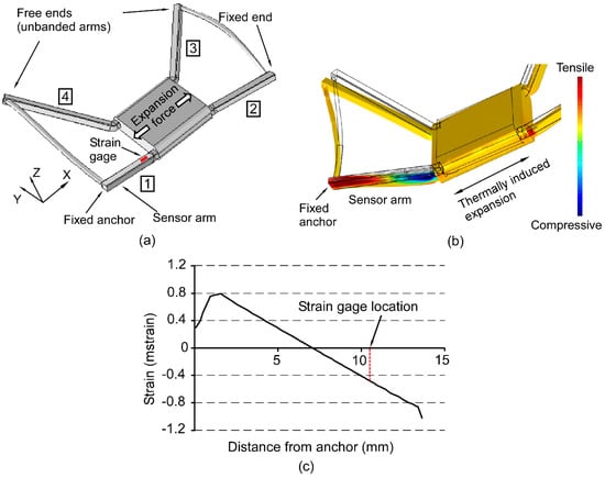 Figure 3. (a) 3D model of the expander used for FEA. The individual expander arms have been numbered. Arm 1 is instrumented with the strain gage. (b) FEA of strain along the expander arm for an arbitrary expansion. Compressive strain is observed at the location of the strain gage on the sensor arm (arm 1). (c) Strain on the top surface of the sensor arm as a function of distance from the fixed anchor.