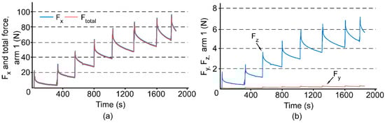 Figure 4. (a) Total force (Ftotal) and force along x axis (Fx), and (b) Fy and Fz on the sensor arm (arm 1) for a total of eight turns of the jackscrew. Fx is dominant component of the total force and Fy is negligibly small.