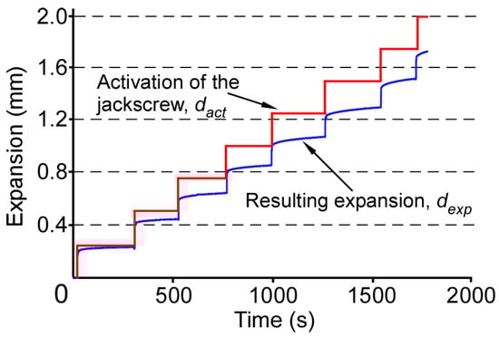 Figure 5. Comparison of the activation of the jackscrew (dact) and resulting expansion (dexp) as a function of time for eight turns of the jackscrew (2.0 mm total activation).