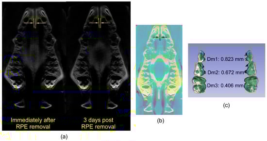 The dental relapse observed in Figure 6c shows that dental tipping is a component of total expansion, in addition to the skeletal expansion, confirming previous observations [2,7,9]. This is expected as the RPE used is a tooth-borne device. Taken together, the sutural patency and dental rebound demonstrate that resistance to expansion offered by skeletal and periodontal tissues contribute to the total expansion force.