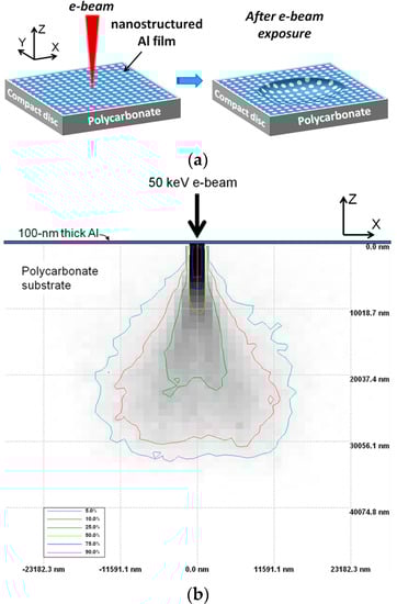 It should be noted that the film/surface shaping technology demonstrated here is suitable to be applied to a variety of thin film materials. In addition to Al, other metals (e.g., Au, Ti, Cr, Ni) can be deposited onto PC CD substrates by well-known deposition methods as thin films that allow 50 keV incident electrons to penetrate into the PC material. Similarly, besides PC, other polymeric materials prone to crosslinking under electron irradiation and capable of hosting thin films (e.g., poly(methylmethacrylate) [14]) could be used as substrates. The use of PC CD is particularly remarkable because it is a highly available, ready-to-use, versatile and cost-effective material support.