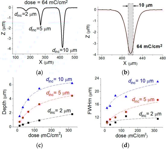 (a) Profiles along the diameter of three dips in an Al NHA/PC sample produced by e-beam irradiation at the same dose (64 mC/cm2) and different irradiated diameters (dinc): 2, 5 and 10 μm. (b) Profile of a single dip (black line) and double sigmoidal fit curve (red line). Dip depth (c) and FWHm (d) vs. electron dose for the considered irradiated diameters. Dashed lines correspond to sigmoidal fits of the measured data.