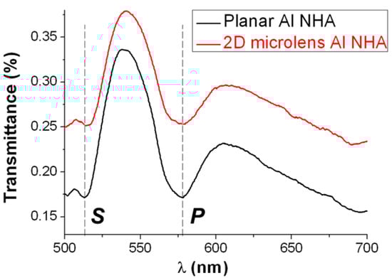 Measured transmittance spectra of a 500-nm-pitch Al NHA on PC-CD before (black line) and after (red line) the fabrication of a 2D array of concave microlenses by electron irradiation. S and P minima are associated to the excitation of SPPs at the metal-air and metal-substrate interfaces, respectively.