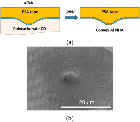 (a) Schematic diagram of the transfer of a concave Al NHA film from a PC CD substrate onto a pressure-sensitive adhesive (PSA) tape by a simple stick-and-peel procedure. (b) SEM image of a transferred convex Al NHA circular pattern on the flexible PSA tape.