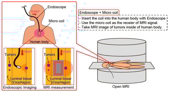 Magnetic resonance imaging (MRI) is a promising method to visualize the inside of a human body from nuclear magnetic resonance (NMR) signal. In recent years, it has been made an attempt to measure the MRI images during surgery for safe and reliable operation [1,2,3]. The endoscopic MRI has also been studied as an attempt of the intraoperative MRI [4,5,6,7,8]. By using MRI endoscopically, as shown in Figure 1, early detection of tumors that occur in deep luminal tissue is expected. Generally, it is difficult to find tumors or cancer cells that have occurred in deep luminal tissue such as the esophagus or the small intestine. Since only surface tissue is observed in the endoscopic imaging, deep tumors cannot be detected by the endoscope. By using a combination of endoscope and MRI, we can acquire the depth of the tumors in addition to detecting the tumors in deep luminal tissues. Furthermore, it is possible to prevent the tumors from cutting away unnecessarily normal tissue.
