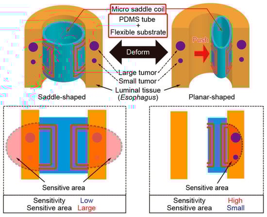 Our concept of the micro saddle coil for local high-resolution MRI of luminal tissue is shown in Figure 2. The micro saddle coil consists of a flexible poly-imide substrate with coil patterns embedded in a polydimethylsiloxane (PDMS) tube. The micro coil was designed for detecting both small and large tumors in the luminal tissue such as the esophagus. The micro saddle coil has a flexible architecture and is deformable into a saddle-shaped mode and a planar-shaped mode.