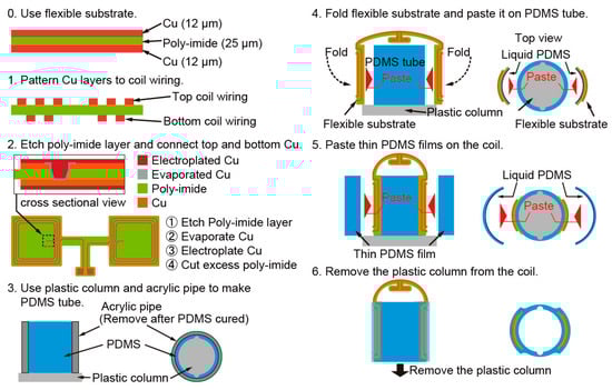 Figure 3 shows the fabrication process of the micro saddle coil. We use the 25-μm-thick flexible poly-imide sheet with 12-μm-thick top and bottom Cu layers. First, the top Cu layer and the poly-imide layer were etched to make a through hole for connecting the top and bottom Cu layers. Then, the top and bottom Cu layers were etched to make the coil wiring. The top and bottom Cu layers were connected by evaporating the Cu and electroplating another Cu layer as shown in step 2 of Figure 3. The thickness of the Cu layers were 50 μm after electroplating. The excess poly-imide layer was cut away, and liquid PDMS was applied as a paste to the back of the flexible substrate. To make the PDMS tube, we pour liquid PDMS between the acrylic pipe and the plastic column with a bump. The flexible substrate was pasted onto the PDMS tube with the plastic column. A thin PDMS film was pasted onto the flexible substrate to prevent it from peeling off. Finally, the PDMS was full cured to fix the flexible substrate into the PDMS tube, and the plastic column was removed.