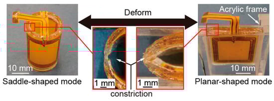 Photographs of the fabricated micro saddle coil. The coil deforms from saddle-shaped mode to planar-shaped mode. Since the polydimethylsiloxane (PDMS) tube has constricted parts, the coil deformations are reproducible.