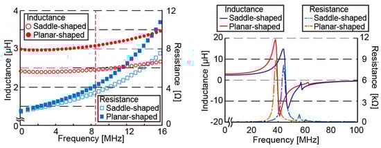 We measured the electrical characteristics of the micro saddle coil in both saddle-shaped and planar-shaped modes. We use the open-type MRI that has the static magnetic field of 0.2 T and the MRI frequency of 8.5 MHz. The electrical characteristics of the micro saddle coil are presented in Figure 5 and Table 1. At 8.5 MHz, the inductance of the saddle-shaped and planar-shaped mode was 2.45 and 3.07 μH, respectively, and their respective resistance was 3.31 and 3.92 Ω. The Q-factor was 39.9 and 42.9, respectively. All three of the resistance, inductance, and Q-factor were increased. Since the Q-factor was increased, deformation into planar form increased the sensitivity of the micro saddle coil. The self-resonant frequency was higher in saddle-shaped mode than in the planar-shaped mode (44.8 MHz vs. 39.5 MHz). It can be concluded that coil deformation reduced the gaps between the coil wirings and increased the parasitic capacitance of the coil.