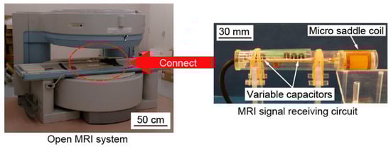 To evaluate the sensitivity and the sensitive area of fabricated micro saddle coil, we took MRI images by using the experimental setup shown in Figure 6. We used an open-type MRI system with 0.2-T static magnetic fields. Excitation coil is embedded in the MRI system together with the permanent magnets, and the fabricated coil received only the NMR signal. The coil was attached to an MRI signal receiving circuit comprising the micro saddle coil, the protection circuit, and two variable capacitors for tuning the frequency and matching the impedance of the circuit. The receiving circuit placed into the acrylic pipe was connected to an open-type medical MRI system. The receiving circuit and measurement object were placed at the center of the MRI system. As compared to the micro saddle coil, we have used a medical head coil, because the medical head coil is the smallest coil among the accompanying coils of the medical MRI system we used. The diameter and length of the medical head coil are about 300 and 350 mm. All MRI images were acquired under the following conditions: spin echo (SE) sequence with a repetition time (TR) and echo time (TE) of 250 and 22 ms, respectively, and a repeat count of 16 times. We took the MRI images of 0.5 × 0.5 × 1.0 mm3 and 2.0 × 2.0 × 2.0 mm3 spatial resolution. The field of view (FOV) and the acquisition matrix were 160 × 160 mm2 and 80 × 80 at the voxel size of 2.0 × 2.0 × 2.0 mm3. Those at the voxel size of 0.5 × 0.5 × 1.0 mm3 were 80 × 80 mm2 and 160 × 160.