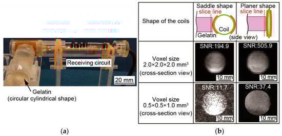 The MRI images taken by the SNR measurement experiment are shown in Figure 7b. We obtained a cylindrical cross section of the gelatin for the SNR measurement. Signal intensity of the signal area was a circle that best inscribed in each image. Signal intensity of the noise area was the average value of the region of the four corners in each image. Then, we calculated the SNR of the MRI image by dividing the signal intensity of the signal area by the signal intensity of the noise area.